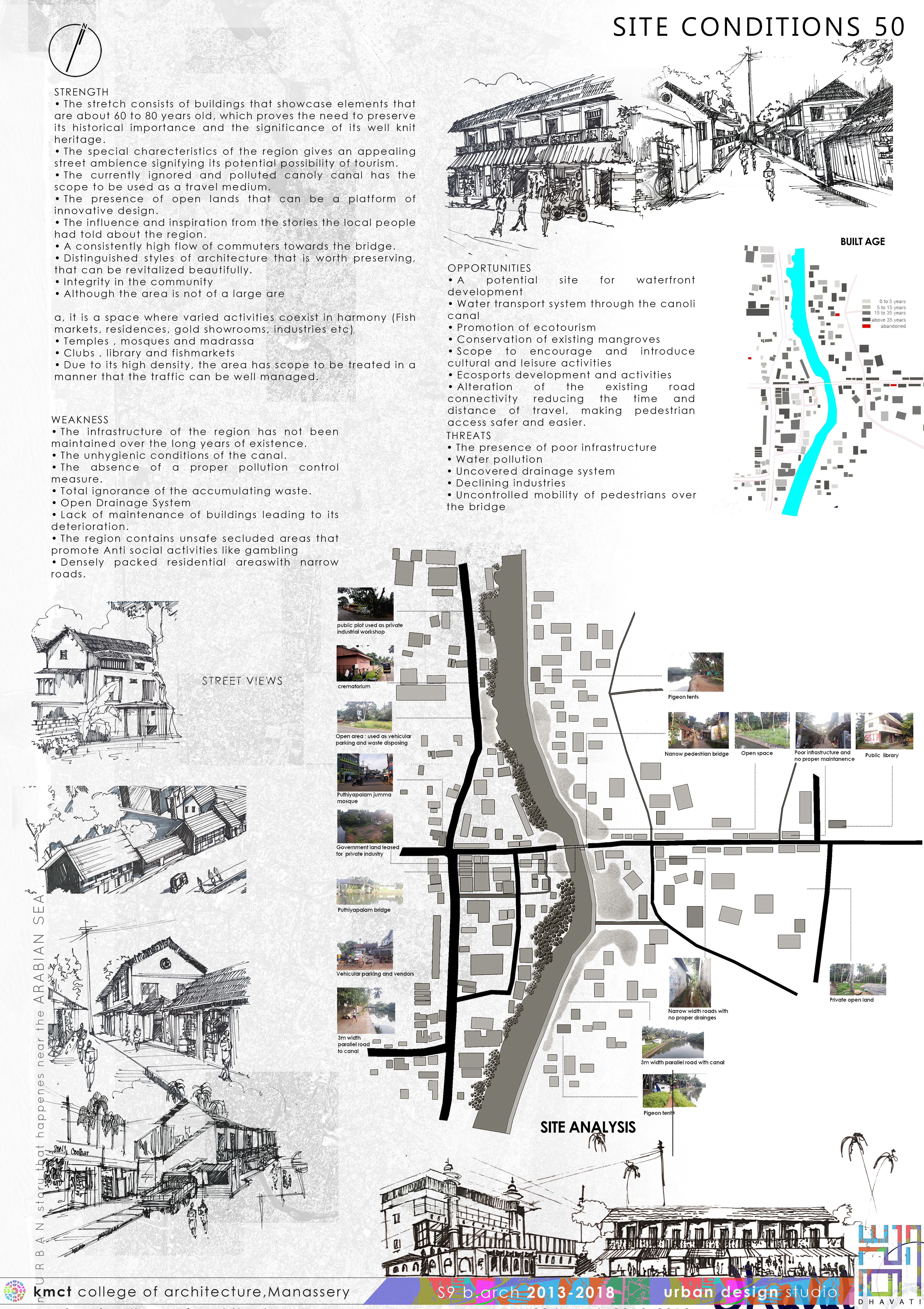 The 9th-semester Urban Design Studio at focused on the Canoli Canal and its surrounding precincts, integrating the themes of ecology, tourism, and socio-economic activities. The studio aimed to explore sustainable urban design strategies that would rejuvenate the canal and its precincts while promoting ecological conservation and enhancing tourism potential. Through in-depth analysis of the canal's history, landscape, and urban fabric, students proposed design interventions that fostered socio-economic growth, improved public spaces, and strengthened the connection between the community and the environment. The project emphasized balancing ecological sensitivity with the economic and cultural vibrancy of the area, creating a vision for a more resilient and thriving urban landscape around the Canoli Canal