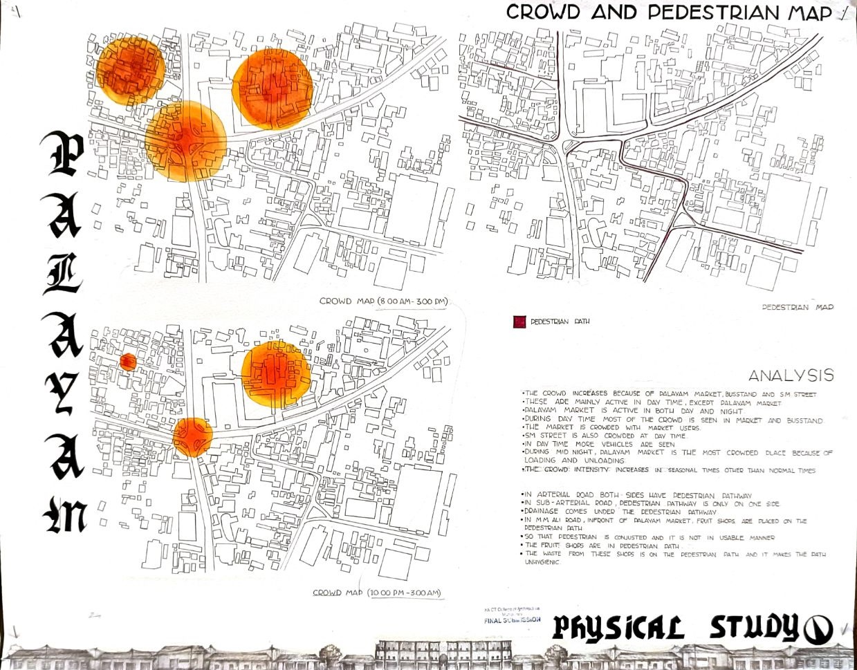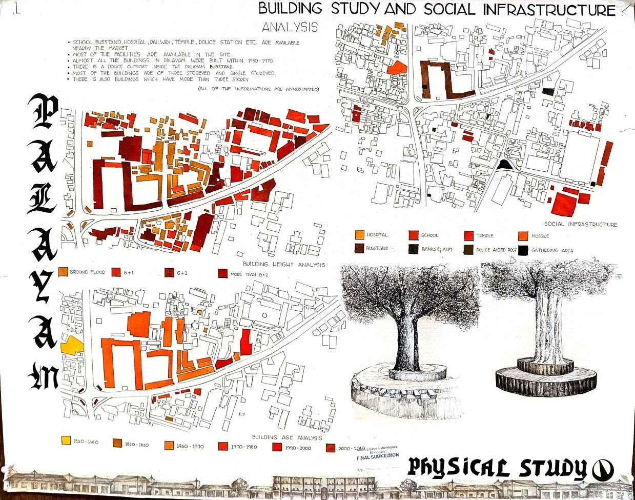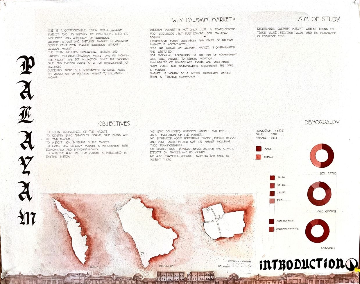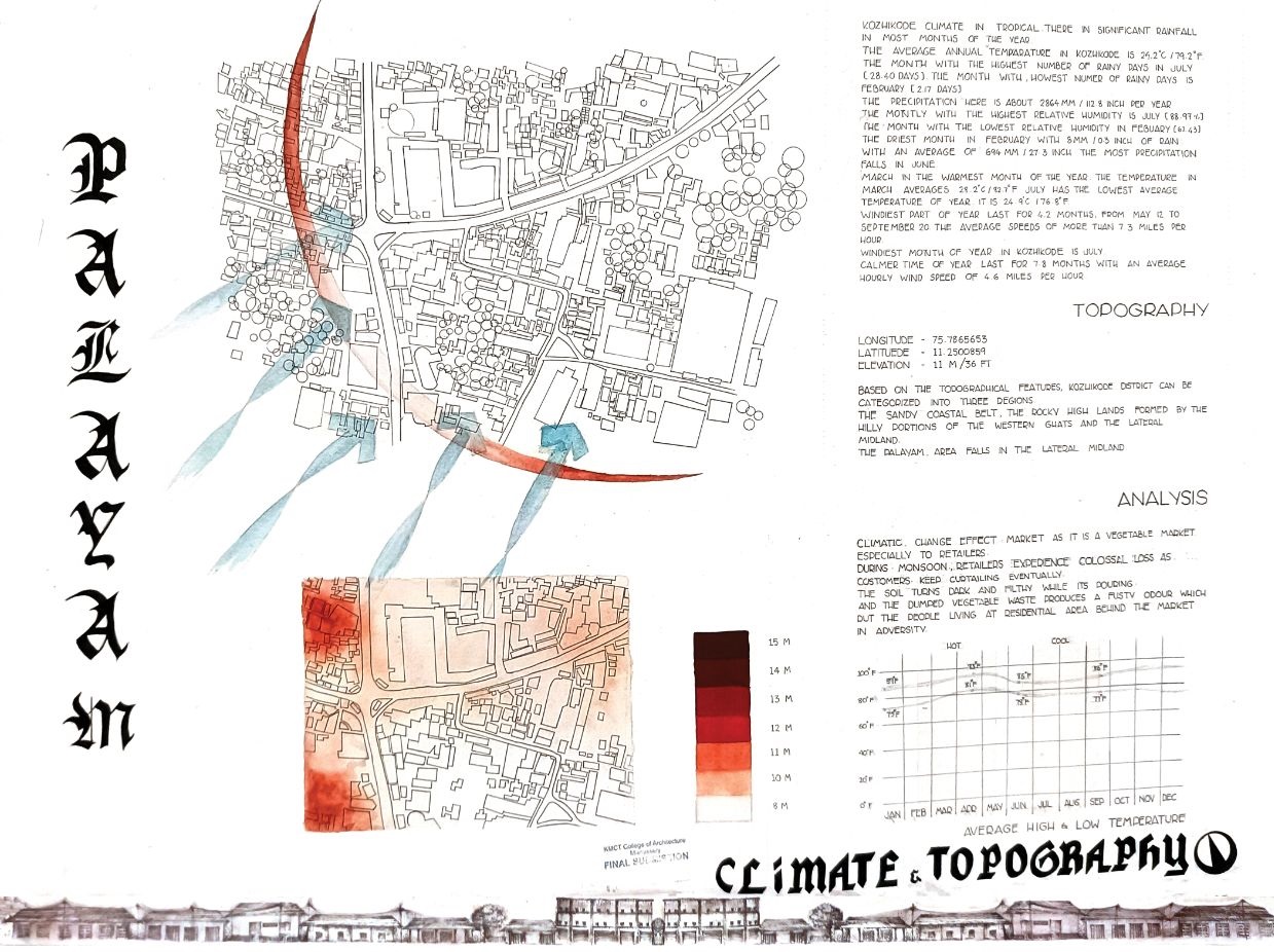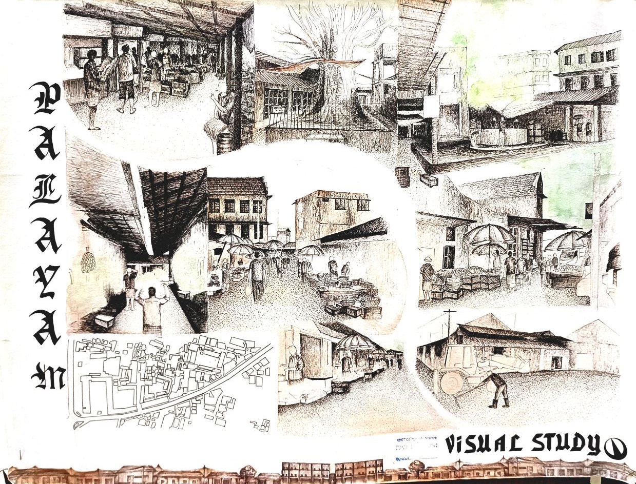 Architectural Design Studio II, as per the University of Calicut’s guidelines, aimed to understand the socio-cultural, geographic, and economic factors that shaped urban and rural built environments. The focus was on organically evolved urban settlements, particularly markets, which played a vital role in city development. Markets grew out of necessity, adapting to socio-political changes and integrating into the urban fabric. Palayam, once a military barracks, became Kozhikode’s largest market and remained significant over time. The studio examined the proposal to relocate the market, evaluating its impact on tradition and culture, and analyzed whether relocation was feasible or if alternative solutions were better