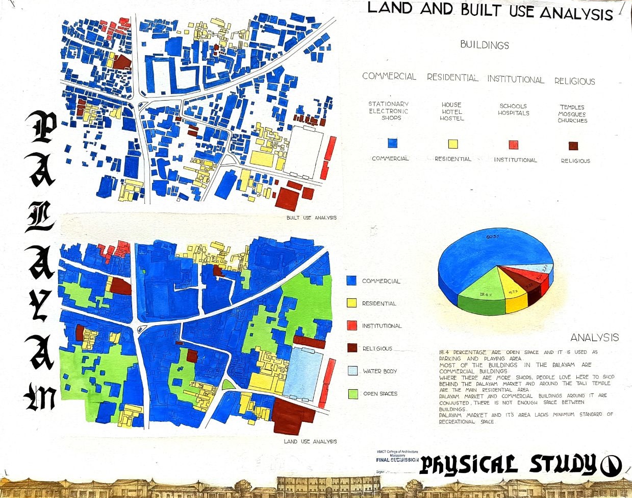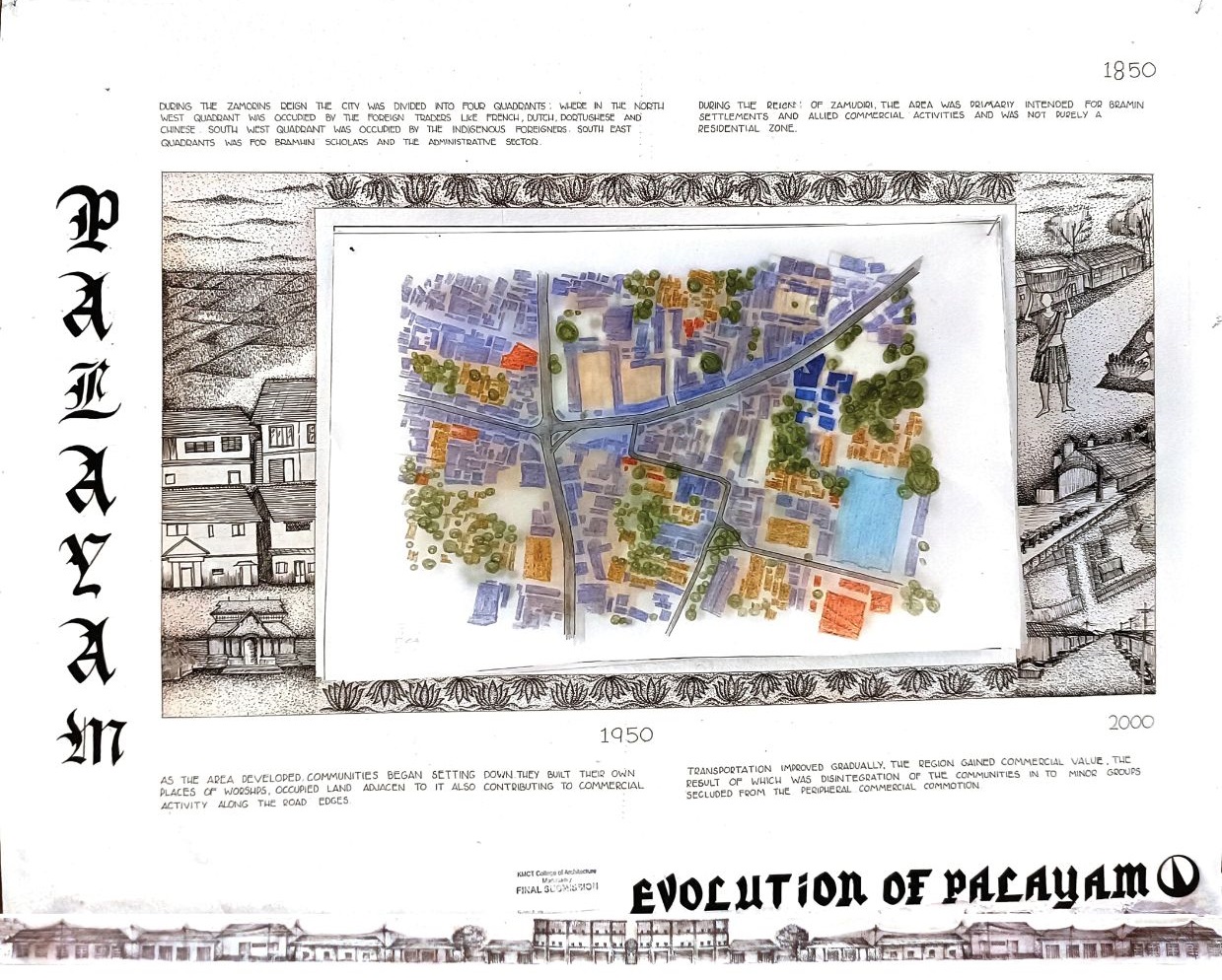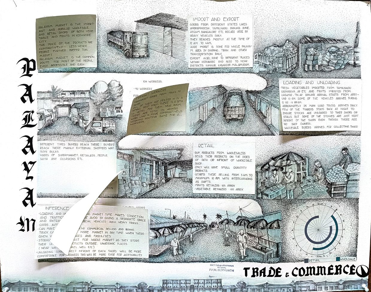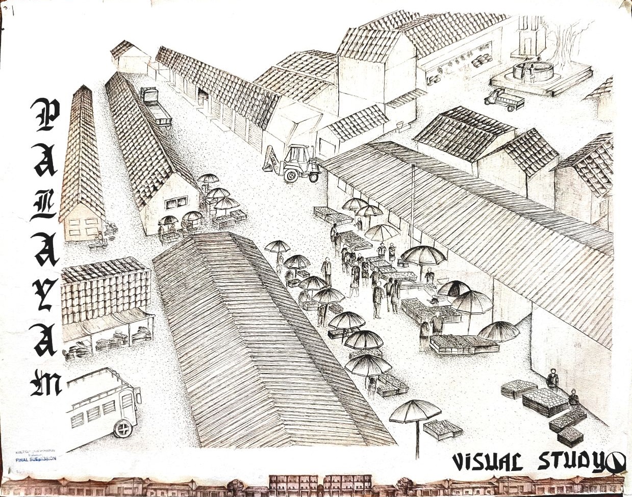 Architectural Design Studio II, as per the University of Calicut’s guidelines, aimed to understand the socio-cultural, geographic, and economic factors that shaped urban and rural built environments. The focus was on organically evolved urban settlements, particularly markets, which played a vital role in city development. Markets grew out of necessity, adapting to socio-political changes and integrating into the urban fabric. Palayam, once a military barracks, became Kozhikode’s largest market and remained significant over time. The studio examined the proposal to relocate the market, evaluating its impact on tradition and culture, and analyzed whether relocation was feasible or if alternative solutions were better