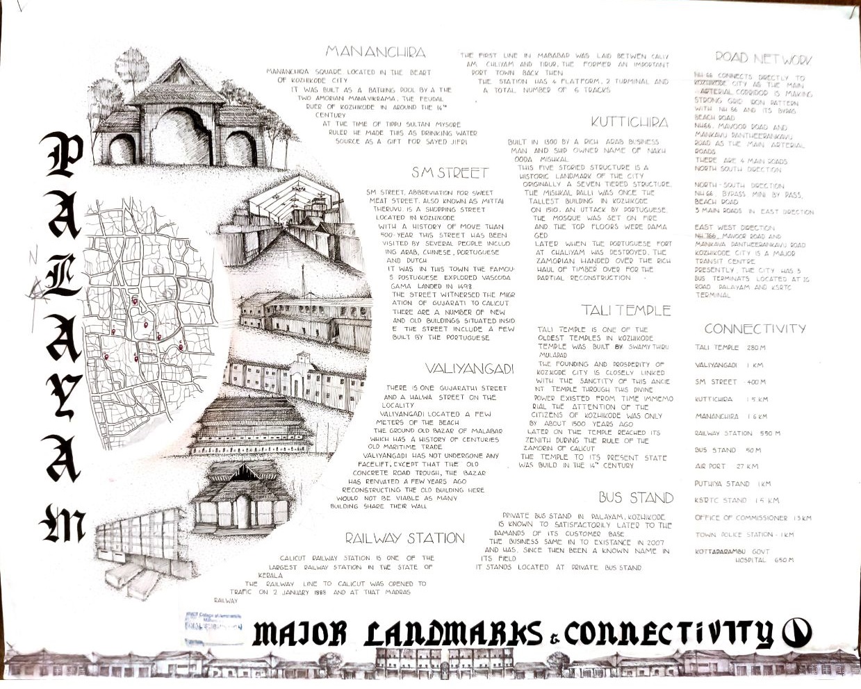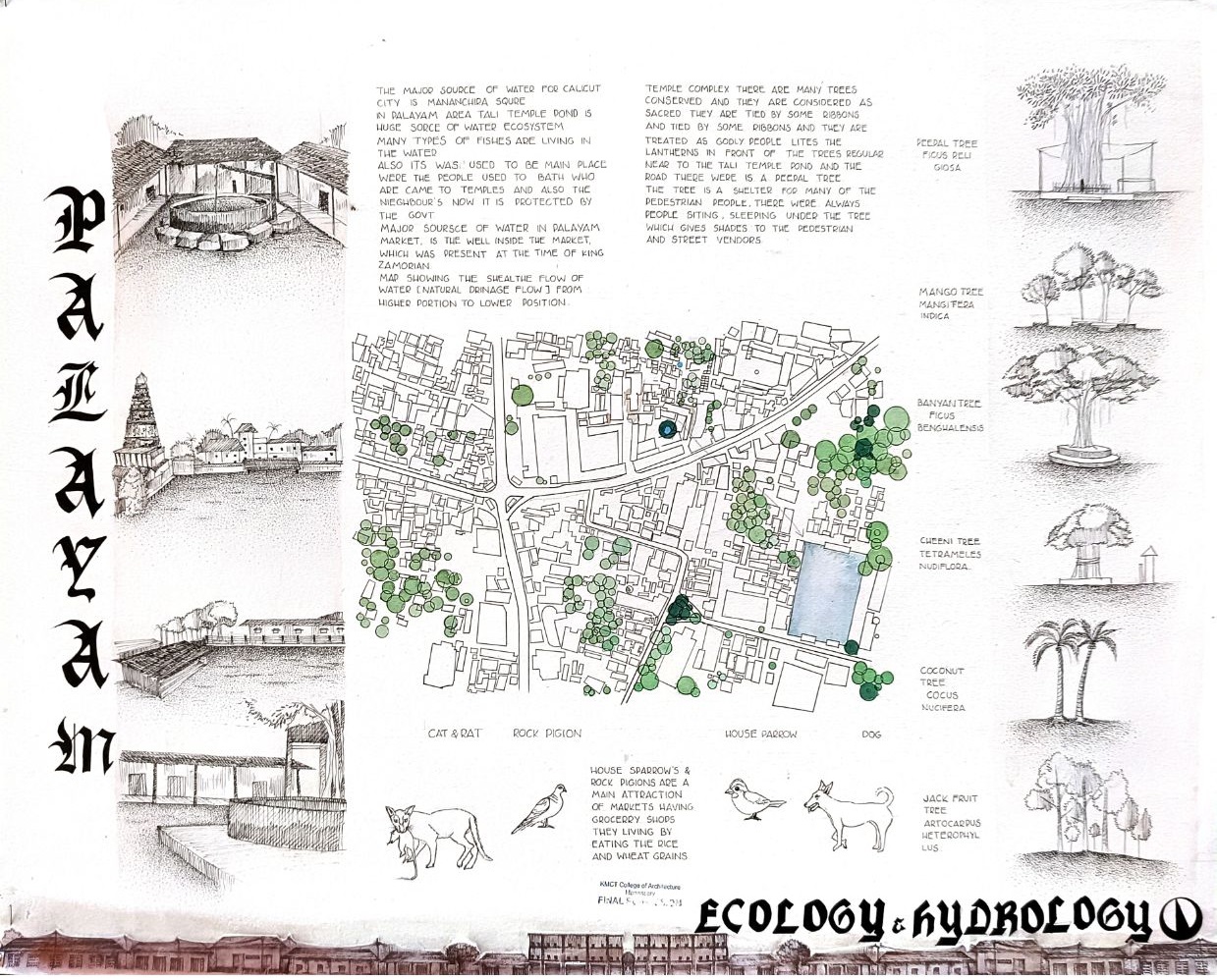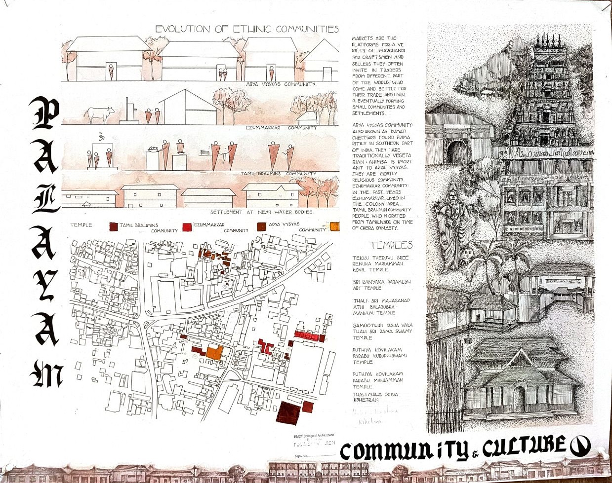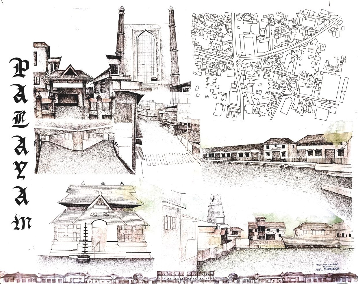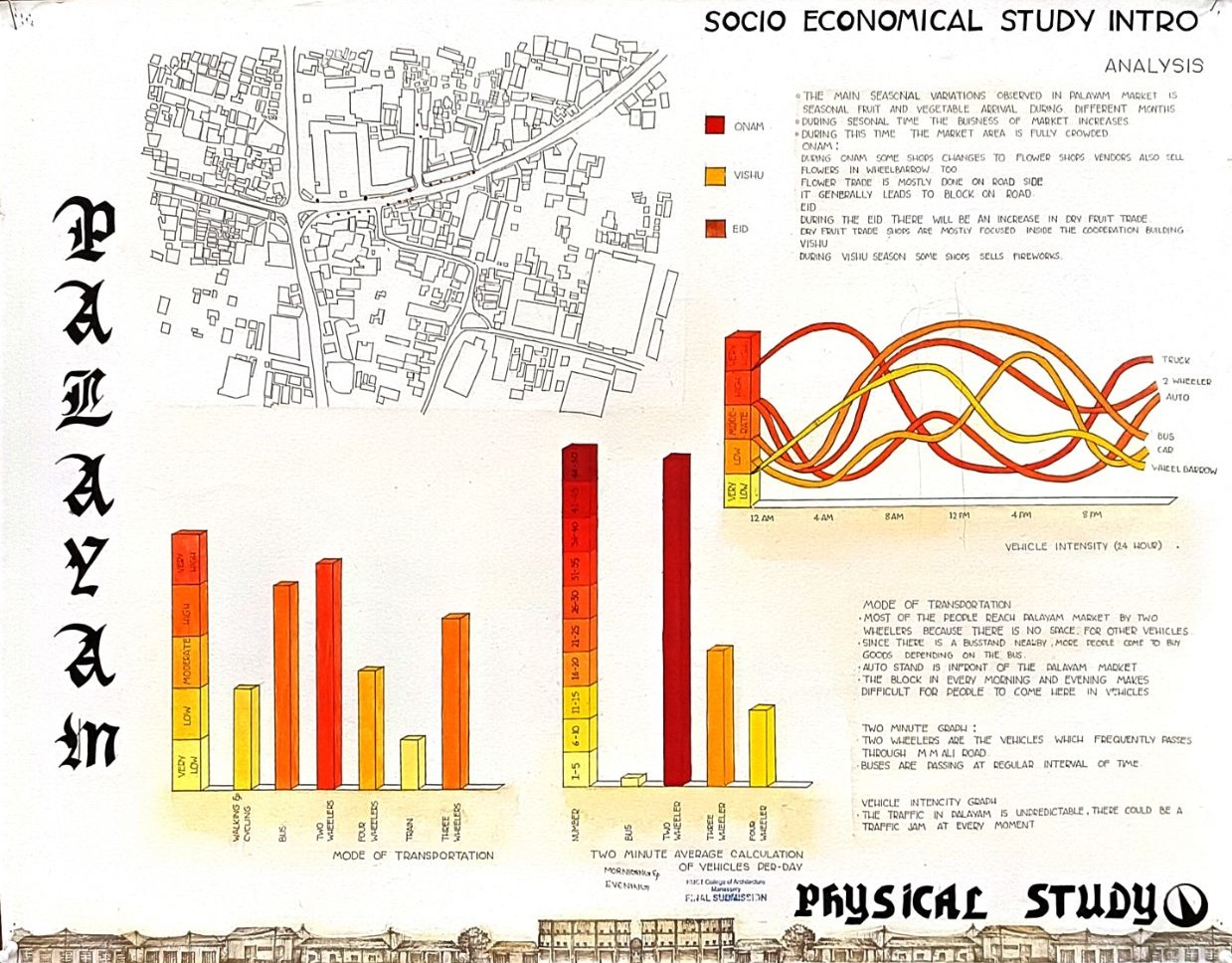 Architectural Design Studio II, as per the University of Calicut’s guidelines, aimed to understand the socio-cultural, geographic, and economic factors that shaped urban and rural built environments. The focus was on organically evolved urban settlements, particularly markets, which played a vital role in city development. Markets grew out of necessity, adapting to socio-political changes and integrating into the urban fabric. Palayam, once a military barracks, became Kozhikode’s largest market and remained significant over time. The studio examined the proposal to relocate the market, evaluating its impact on tradition and culture, and analyzed whether relocation was feasible or if alternative solutions were better
