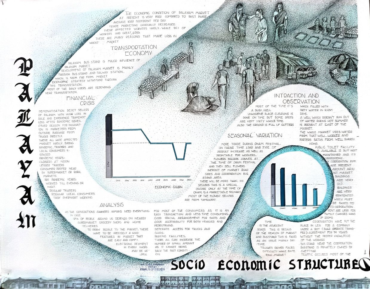 The studio project was designed and executed in several steps. First, a contextual study of the Palayam market and its surroundings, including built and unbuilt spaces, socio-economic, and socio-cultural aspects, was conducted. Based on the case study analysis and data collection, a design brief was prepared, followed by a proposal for the market's relocation to a new site