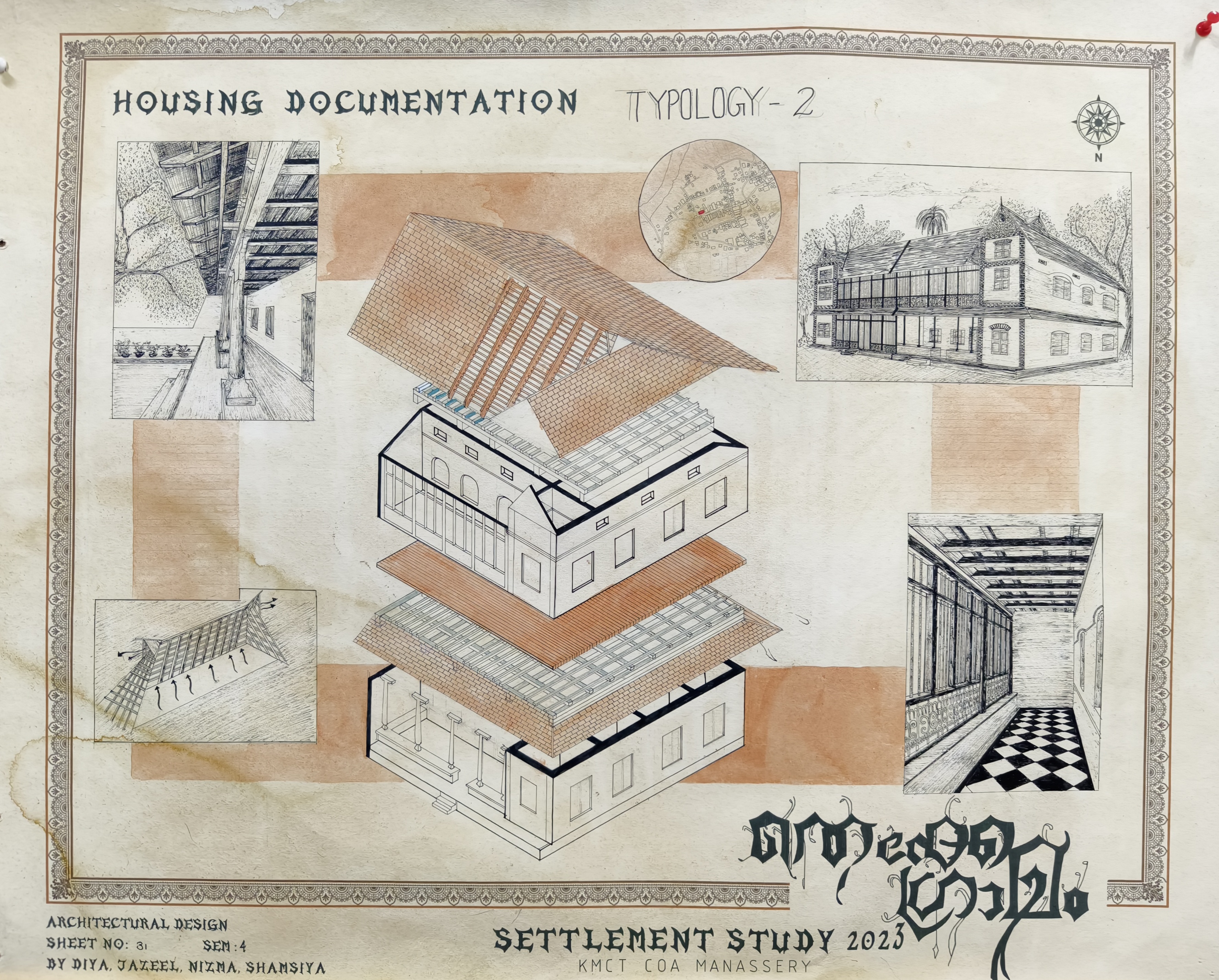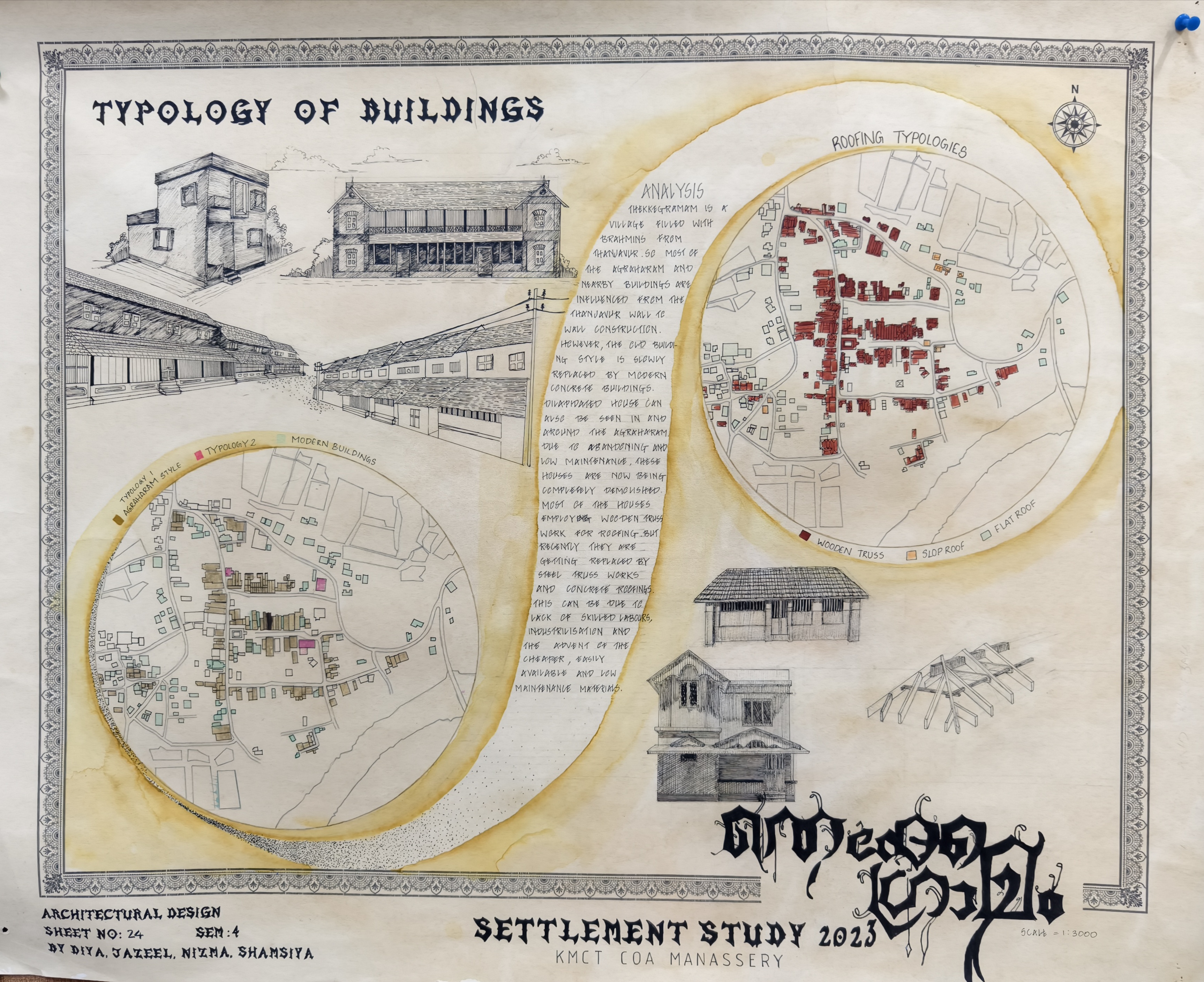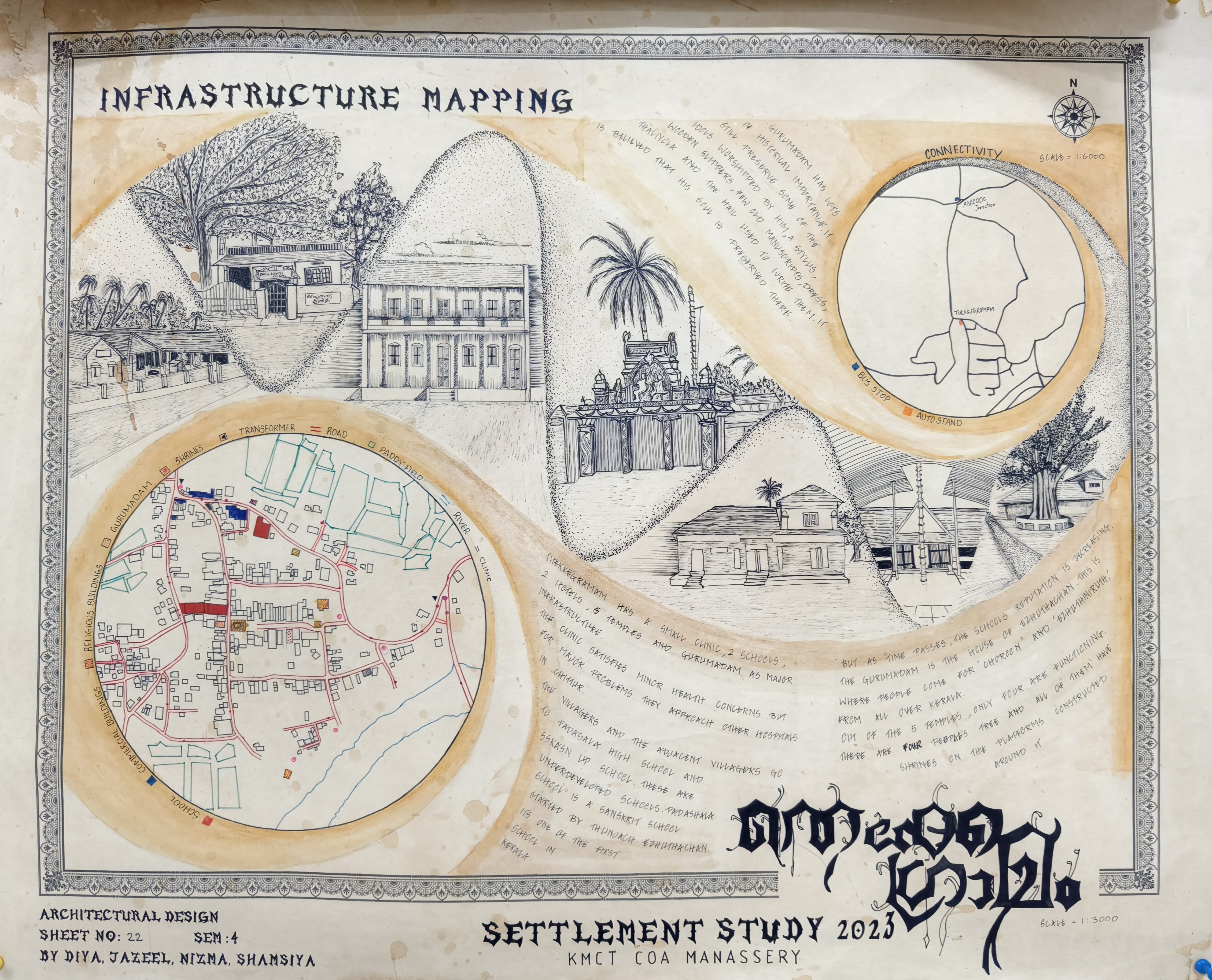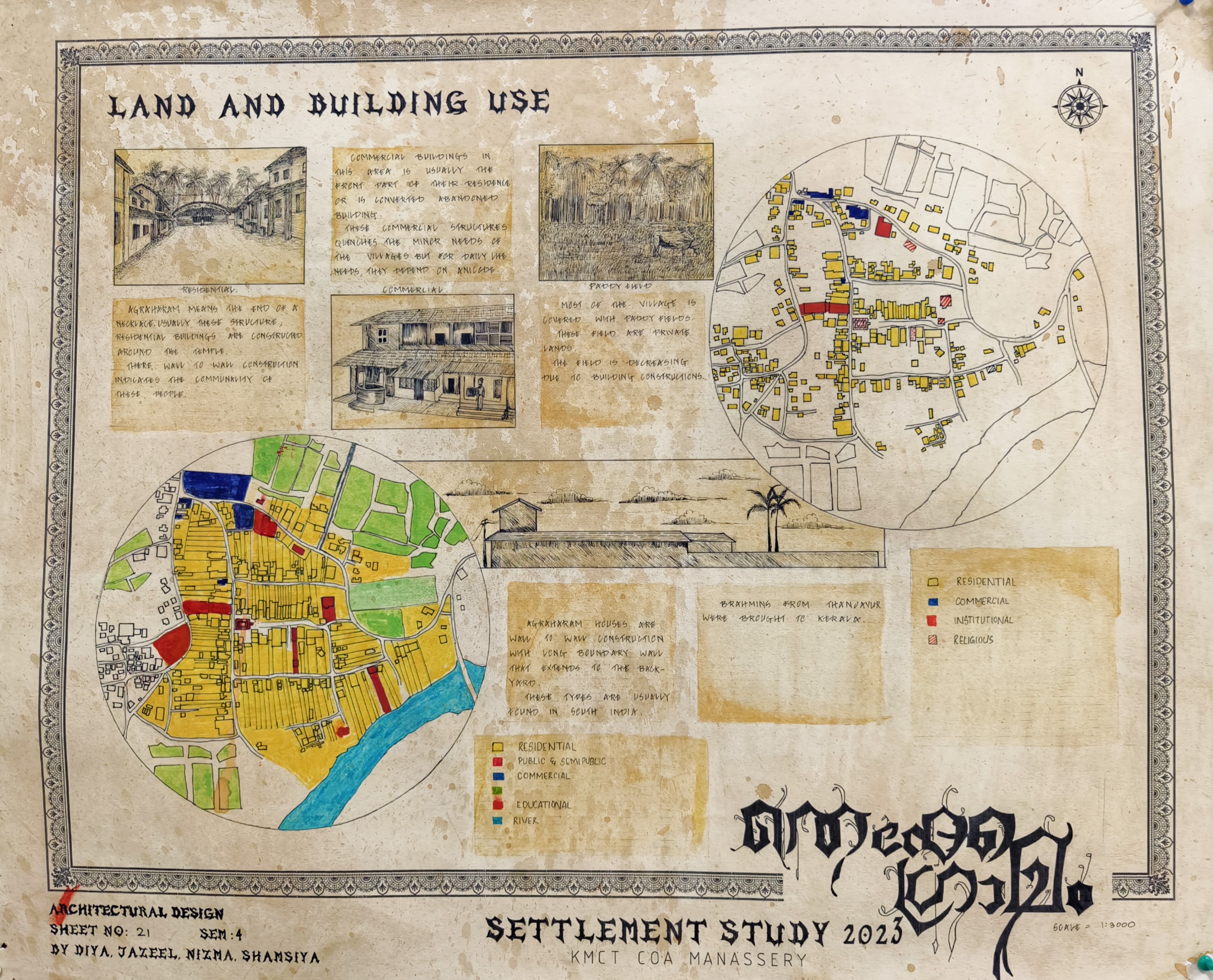 The Architectural Design Studio II, as part of the University of Calicut's curriculum, focused on exploring how socio-cultural, geographic, and economic factors shape both urban and rural environments. The studio particularly emphasized the organic development of urban settlements, analyzing the historical forces that have influenced city formation. Special attention was given to traditional settlements, such as Thekkegramam, a Brahmin settlement situated near a river, and other communities that evolved around temples.