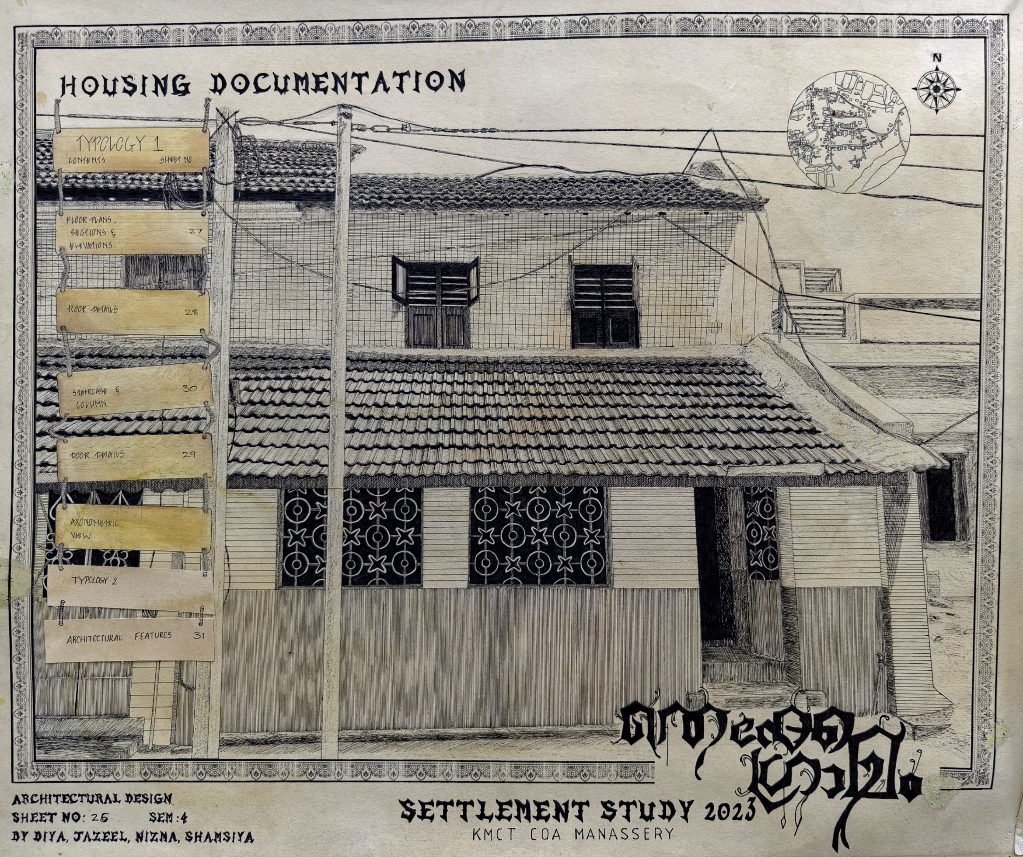 The project progressed through multiple phases, beginning with an in-depth contextual study aimed at understanding the physical and social landscape of the area. This included analyzing both the built and unbuilt environments, as well as the socio-economic and socio-cultural dynamics of the region. Based on this comprehensive analysis and data from case studies, a design brief was developed. The final phase involved creating a settlement proposal for Thekkegramam, capturing its distinctive historical and cultural significance.